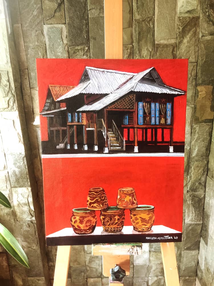 Haron Mokhtar is known for his distinctive "Melayu Pop" style, blending traditional Malaysian culture with contemporary elements. His works often reflect critiques of social, cultural, and historical themes, using iconic Malay symbols, architecture, and landscapes.