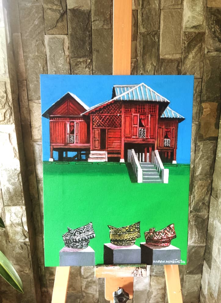 Haron Mokhtar is known for his distinctive "Melayu Pop" style, blending traditional Malaysian culture with contemporary elements. His works often reflect critiques of social, cultural, and historical themes, using iconic Malay symbols, architecture, and landscapes.