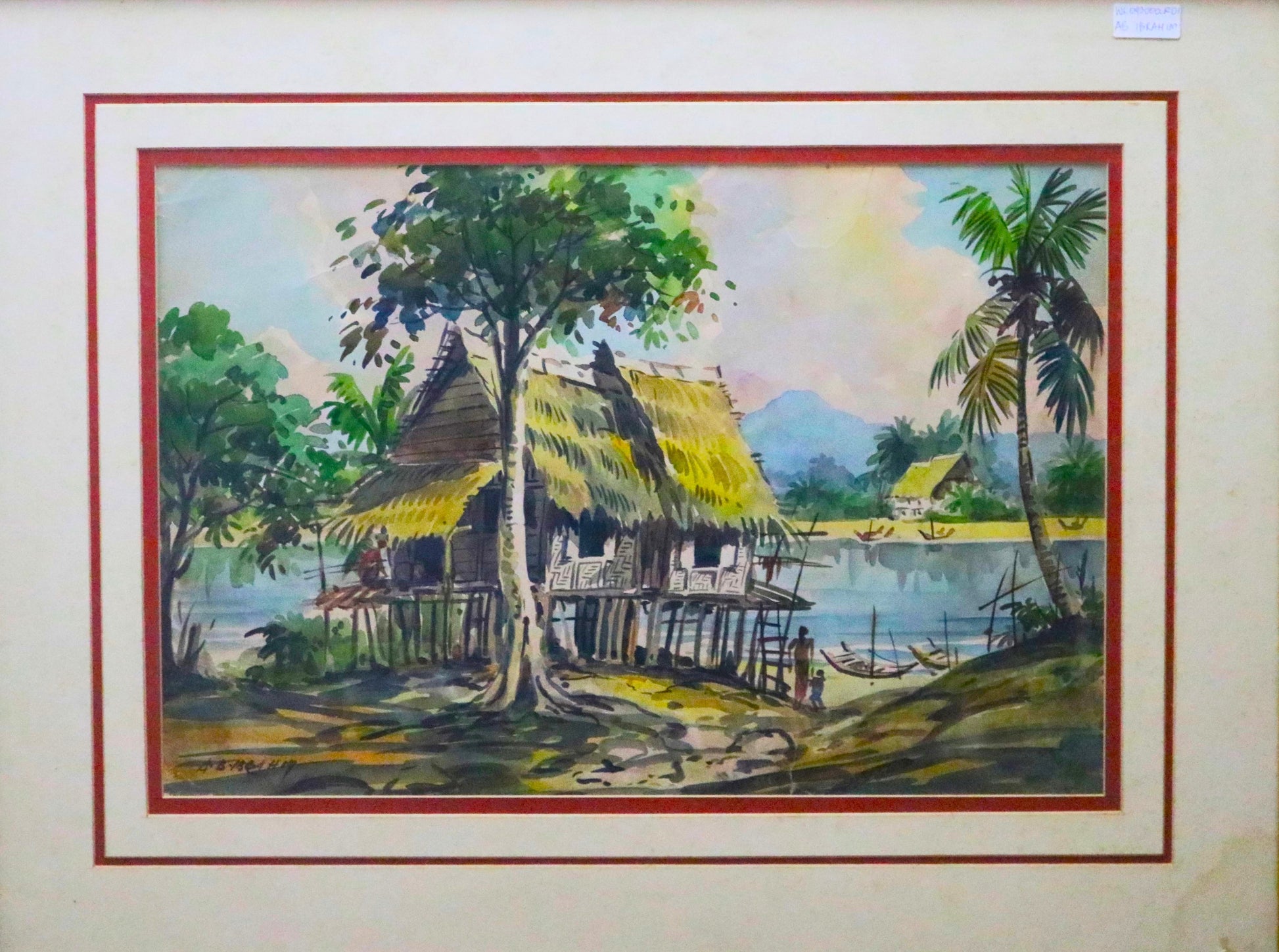 A beautiful, tranquil village scene is presented in this composition, and displays A.B. Ibrahim’s mastery of watercolour techniques. Executed in light and fluid brush strokes typical of the artist’s style, the work highlights the soothing colours of the sea and the coastline, with boats nestled along shore.