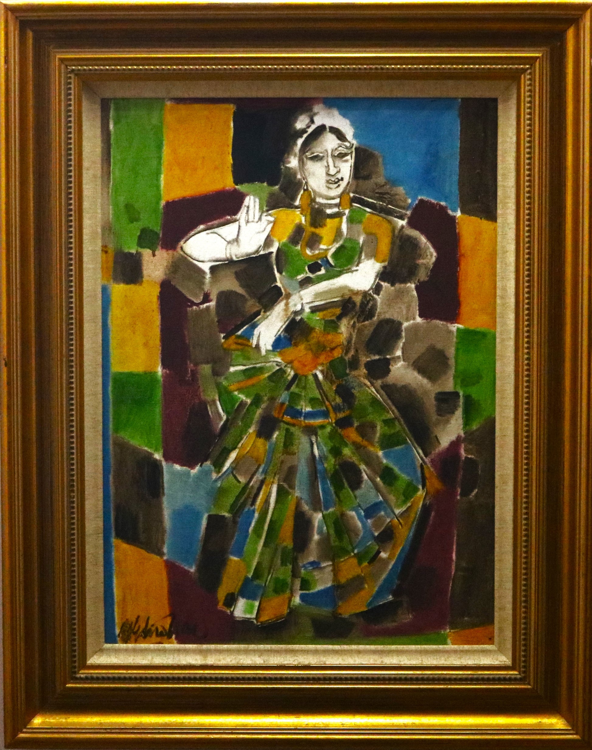 Alphonso Arul Doss was born into a Christian family in 1939 in Bangalore, where he spent his childhood years and attended St. Joseph's School. His involvement with church-related activities growing up was a strong influence on his art. "Looking up at the stained-glass window of a Gothic church, I found myself dazzled by the light transformed into patterns. The contours and colours attracted and motivated me to look at creating forms like a gemstone reflecting many facets." (Artist quoted in Sujatha Shankar Kumar, "Six Decades of Art," The Hindu, 10 March 2014, online) Indeed, his works are known for their deliberate blank, white spaces of canvas deliberately left out to mimic the passage of light through precious stones.