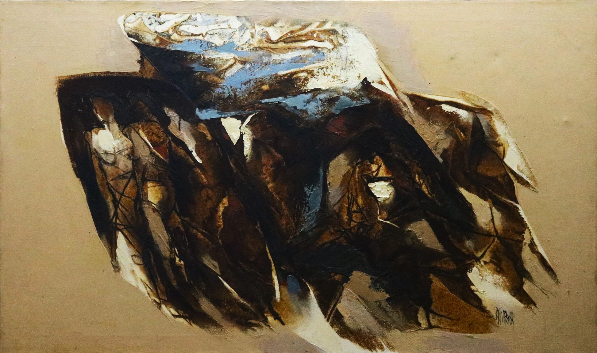 The canvases created by Adivrekar are pure color poetry and bear the unmistakable genius fingerprint. The lovely coastal region from which Adivrekar comes originally from is reminiscent of the blue of the sea, the white of the surf, clouds, birds, golden sands, and dark rock that gleams in the sunlight. He has taken all of these and turned them into symbolic, non-naturalistic abstract art forms. His paintings are a visual feast and a beautifully balanced work of art because of the strong imagery and gorgeous color blending.